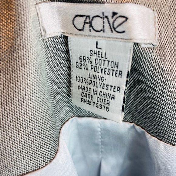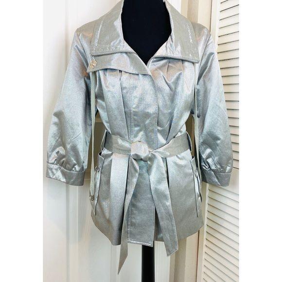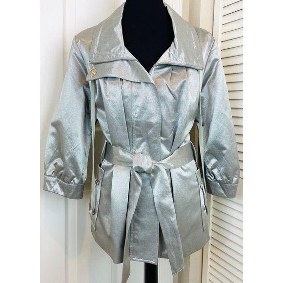 Caché Women’s Metallic Silver Jacket belted at waist, fully lined Zip Up 3/4 Length Sleeve