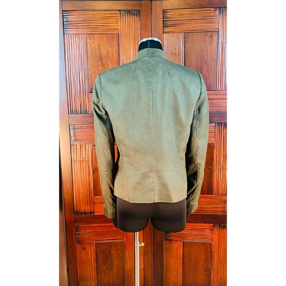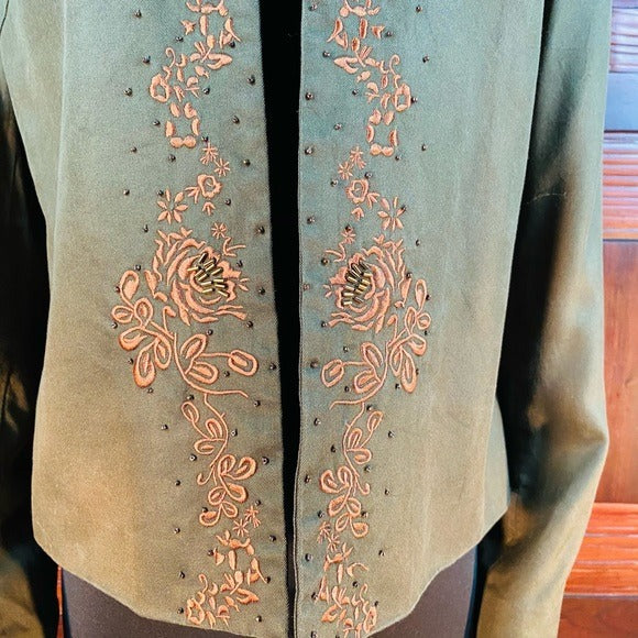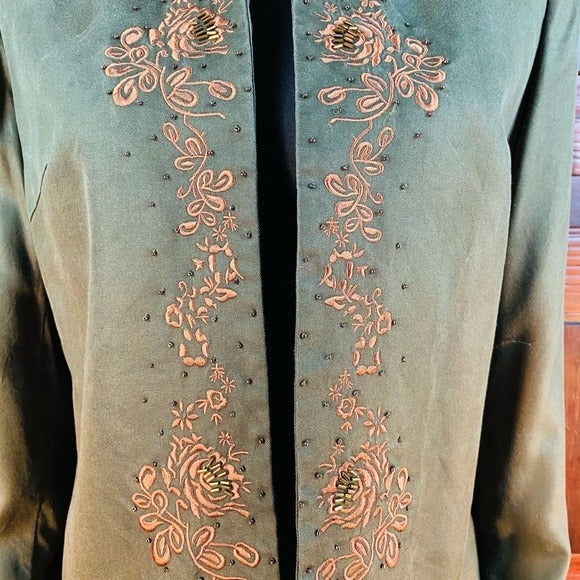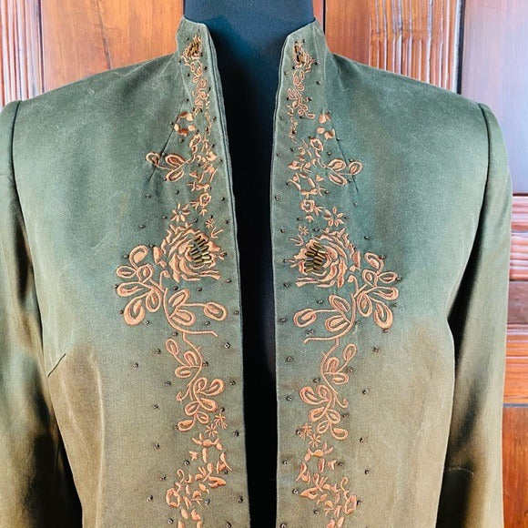 Olive Silk Mandarin Collar Embroidered Beaded Blazer Jacket Sport Coat Sweater