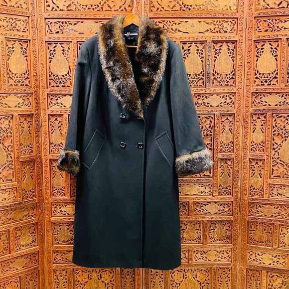 Vintage JP 1893 Women’s Full Length Wool Coat with Faux Fur Collar & Sleeves Trench Coat
