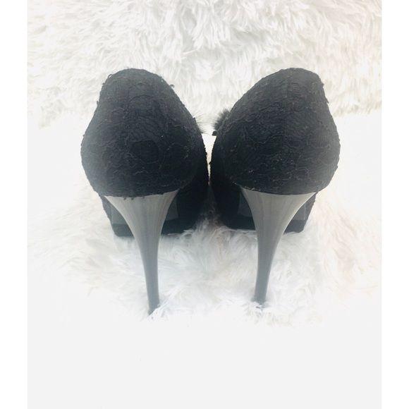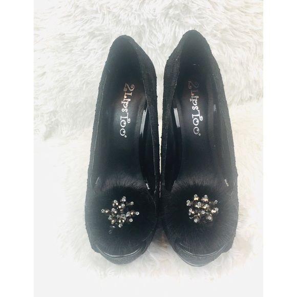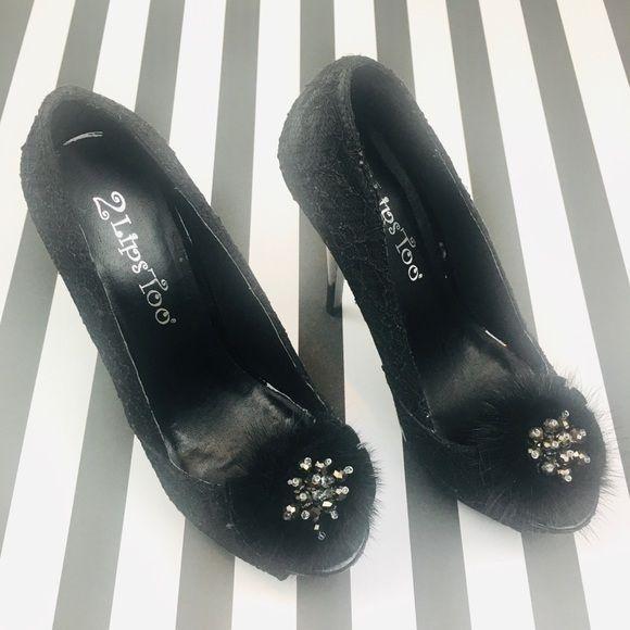 🛍 2LipsToo Black Lace Fur Silver Beaded Peep Toe Heel Pump Stiletto