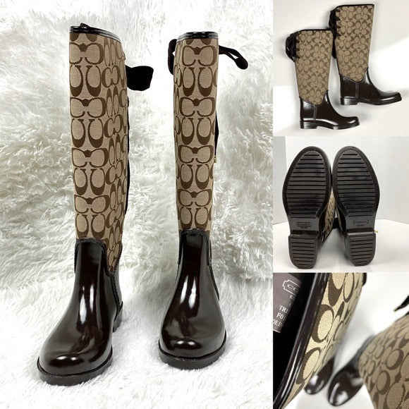 Coach Signature Logo Brown Tall Rain Boots with Lattice Lace Up Closure on Calf, Winter Boots, Rain Boots, Designer Boots 🧵Model: Tristee 📏Size: 6B 🧺Clothing is steamed laundered 🧼 sanitized🧺 💡Sold as pictured. 🧾Sold as is. Thank you for looking. We’re Always Open to Offers & Bundle Savings😊
