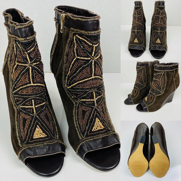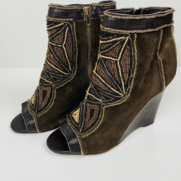 June Ambrose Suede & Leather Beaded Open Toe Ankle Booties Zipper Closure