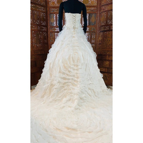 Strapless Hand-beaded Layered Ivory Organza Floral Wedding Dress with Train Corset Tie-Back Closure