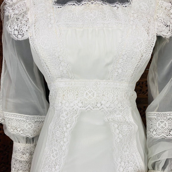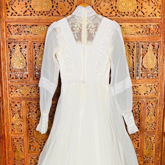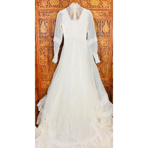 Vintage Edwardian Wedding Gown, Antique Bridal Gown, Lace, Crochet Pearl Beads, Long Sleeve, Ruffle Cuffs, Victorian High Neckline, Court Train