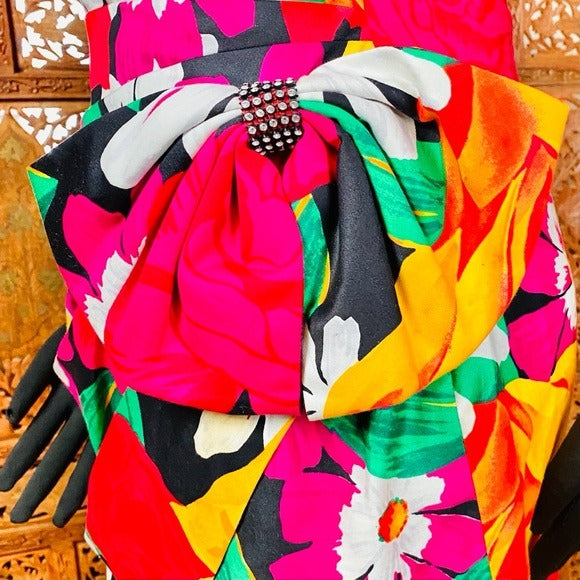 Vintage 1980’s A.J. Bari Floral Strapless Dress Side Bow w/Rhinestone Accent