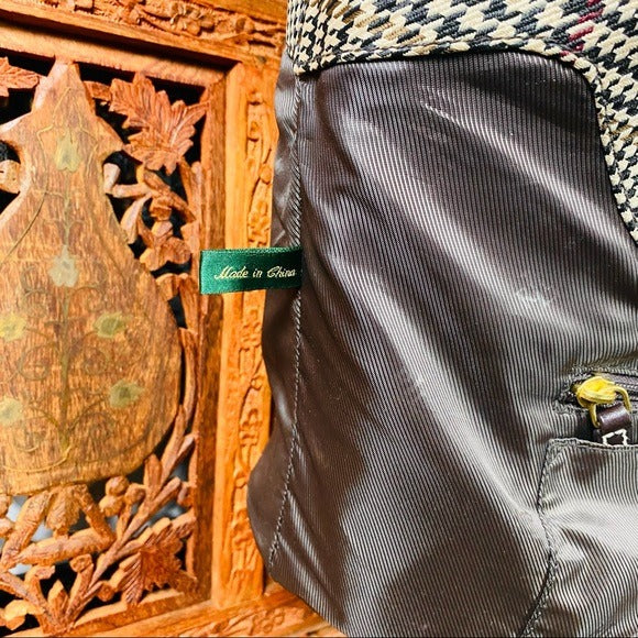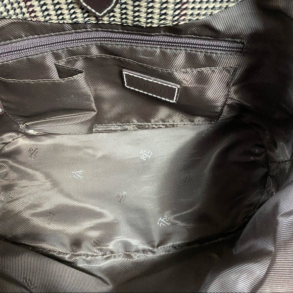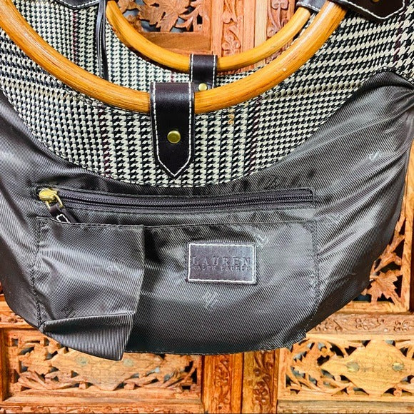 Vintage Ralph Lauren Houndstooth Handbag, Shoulder Bag, Purse, Logo on Leather Strap, Houndstooth Coin purse on leather strap, Wood and Leather
