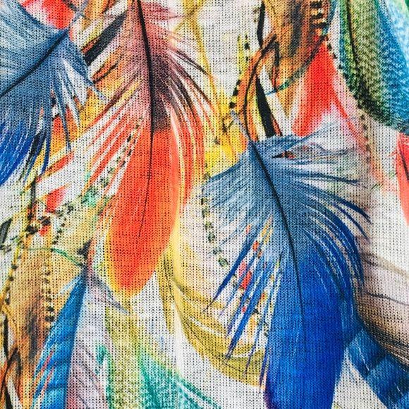Sleeveless asymmetrical tunic white with multicolor feathers