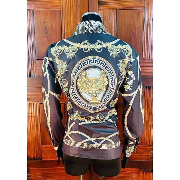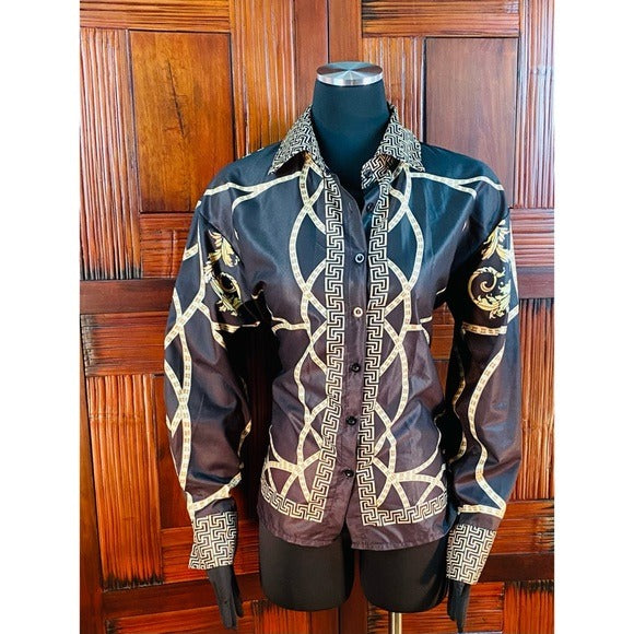 Versace Barocco Medusa Inspired Long Sleeve Button Down forgiving Stretch Blouse