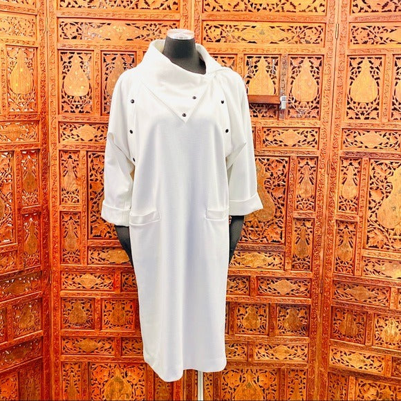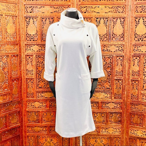Vintage Leslie Fay Women’s Cowl Neck Sweater Dress Cuff Sleeves Adjustable Button Neckline Two Front Pockets
