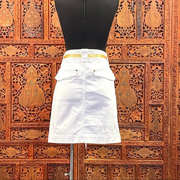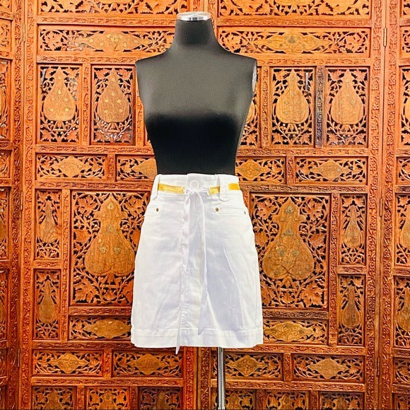 Vintage White House Black Market White Denim Mini Skirt with Gold & White Ribbon Tie Belt